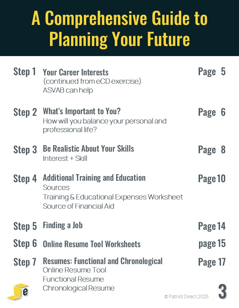 The eCareer Direction program meets virtually all mandated career guidance criteria. Each student receives a workbook which is organized into 7 steps: